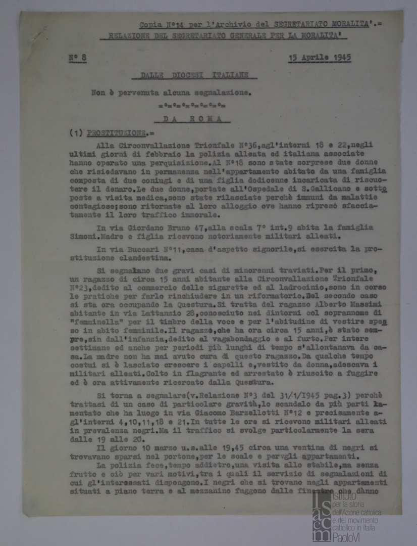 "Relazione del Segretariato Generale per la Moralità. Nr. 8"