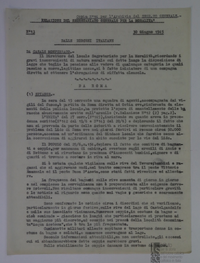 "Relazione del Segretariato Generale per la Moralità. Nr. 13"