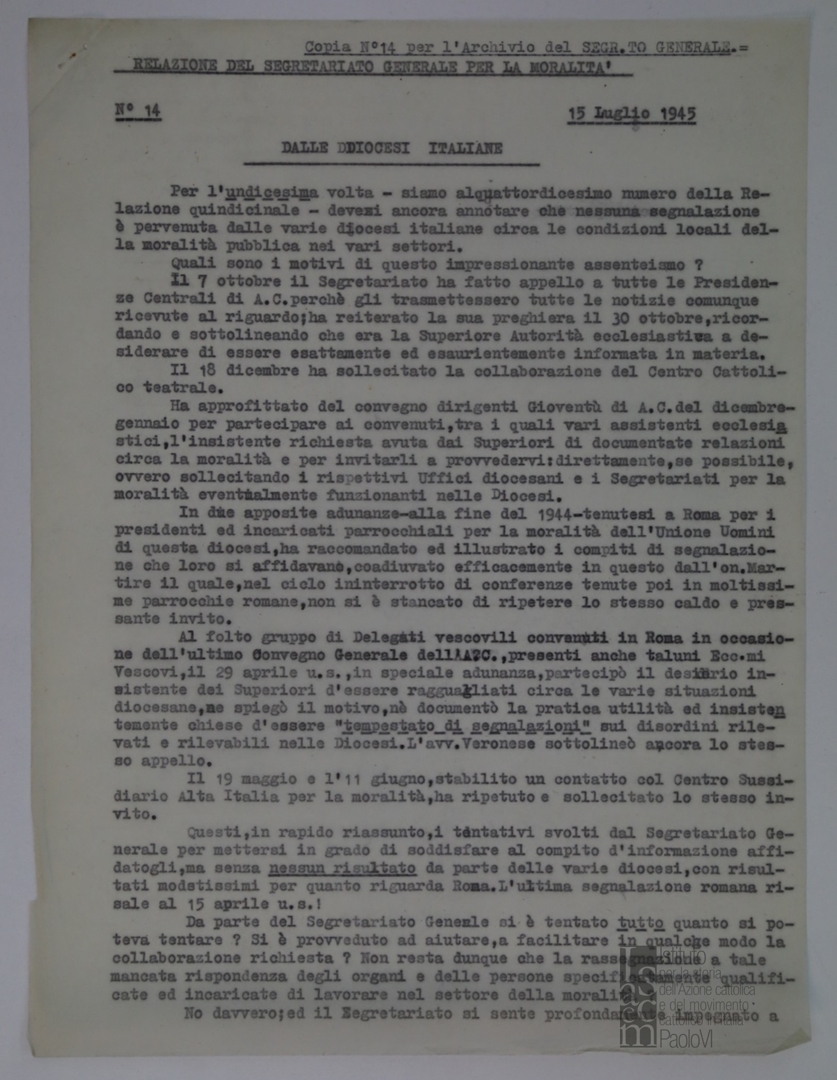 "Relazione del Segretariato Generale per la Moralità. Nr. 14"