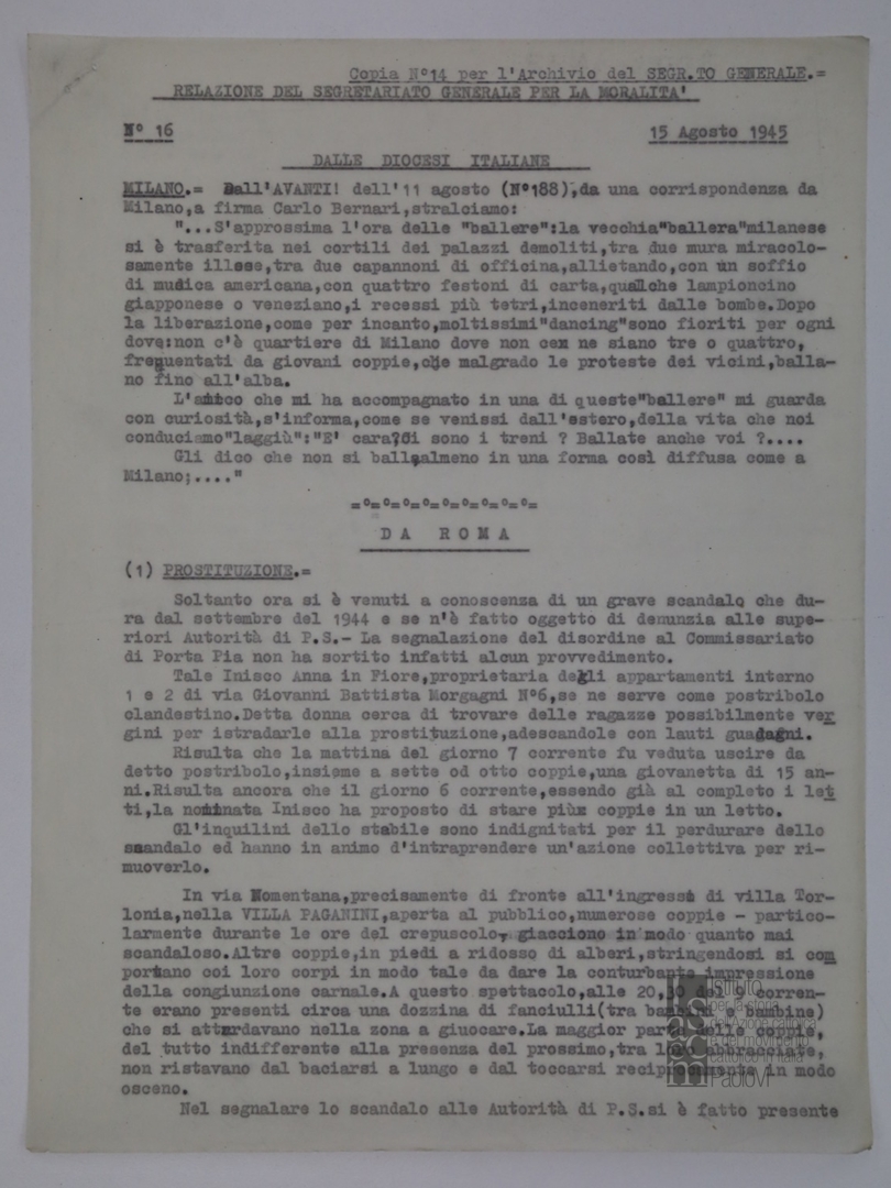 "Relazione del Segretariato Generale per la Moralità. Nr. 16"
