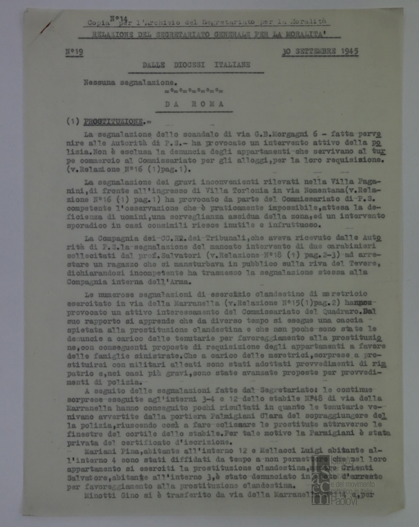 "Relazione del Segretariato Generale per la Moralità. Nr. 19"