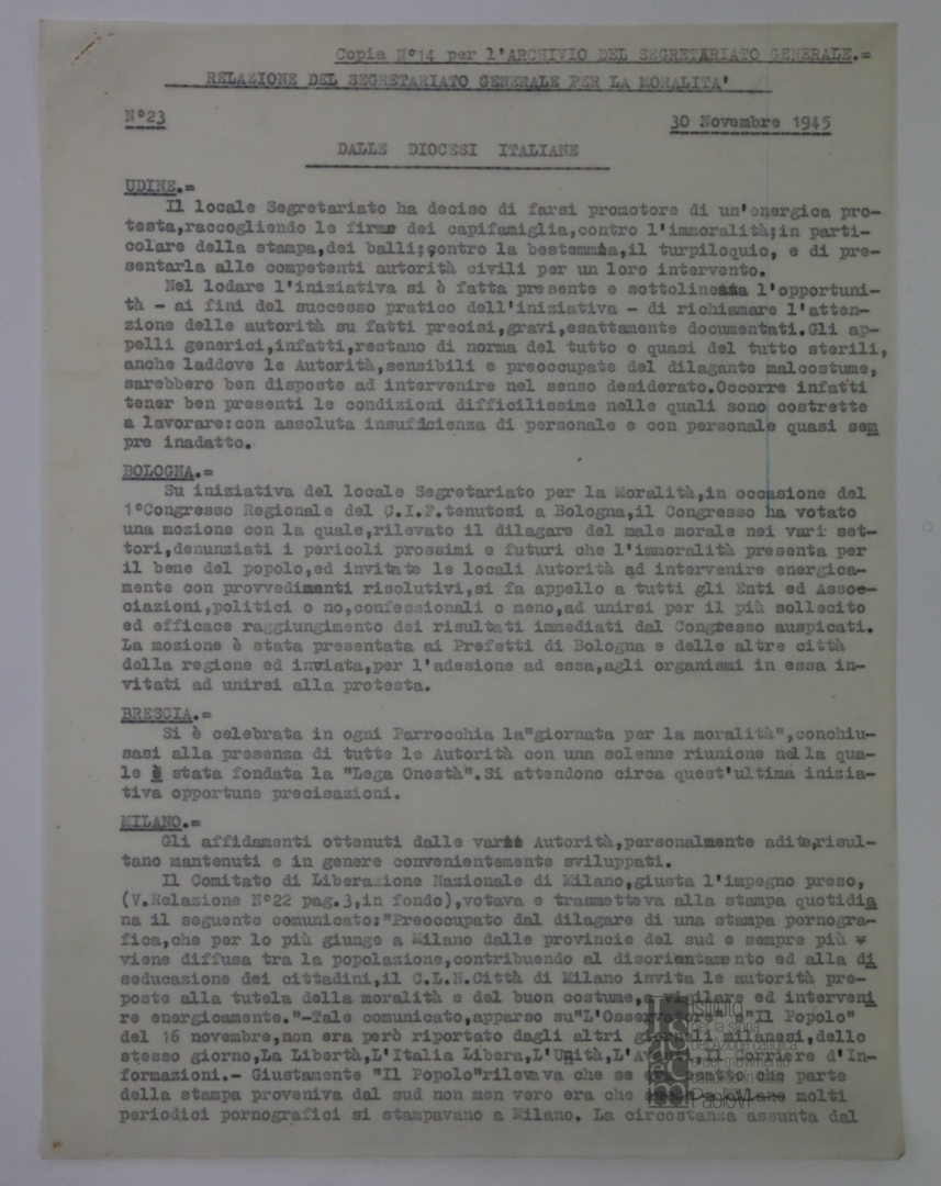 "Relazione del Segretariato Generale per la Moralità. Nr. 23"