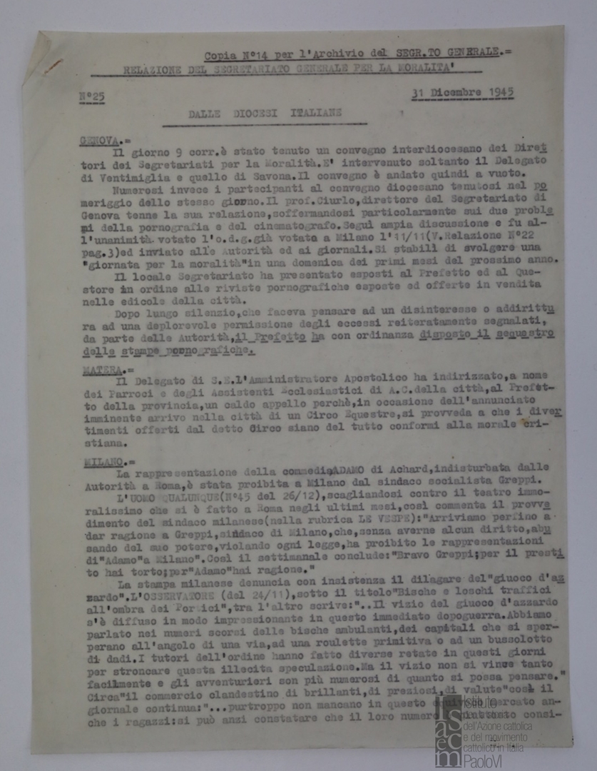 "Relazione del Segretariato Generale per la Moralità. Nr. 25"