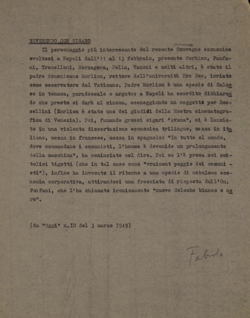Lettera a firma di padre Félix Morlion, direttore dell'agenzia di stampa cattolica Centro di informazione Pro Deo - CIP, ai lettori delle pubblicazioni periodiche dell'Università
