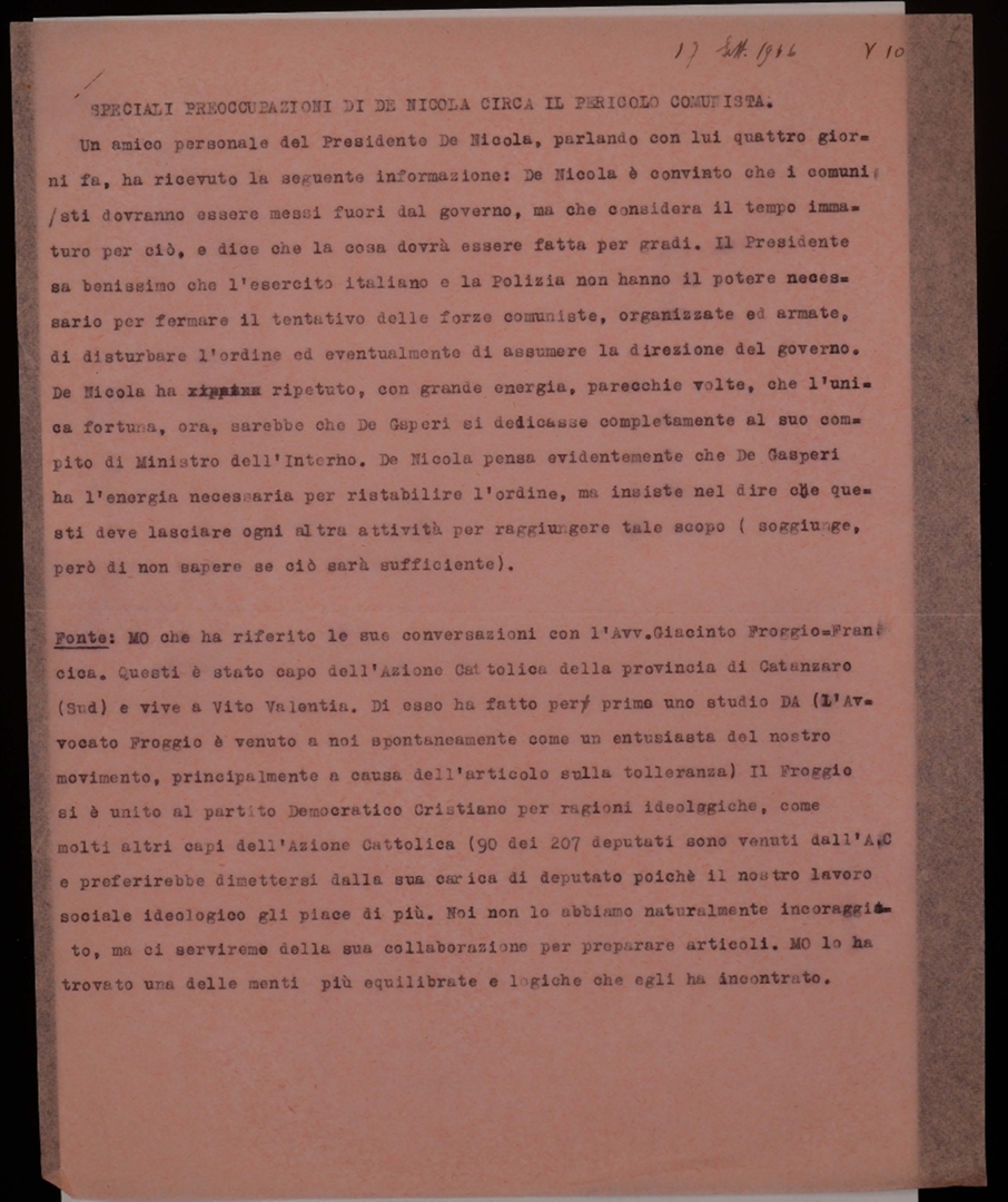 "Speciali preoccupazioni di De Nicola circa il pericolo comunista"