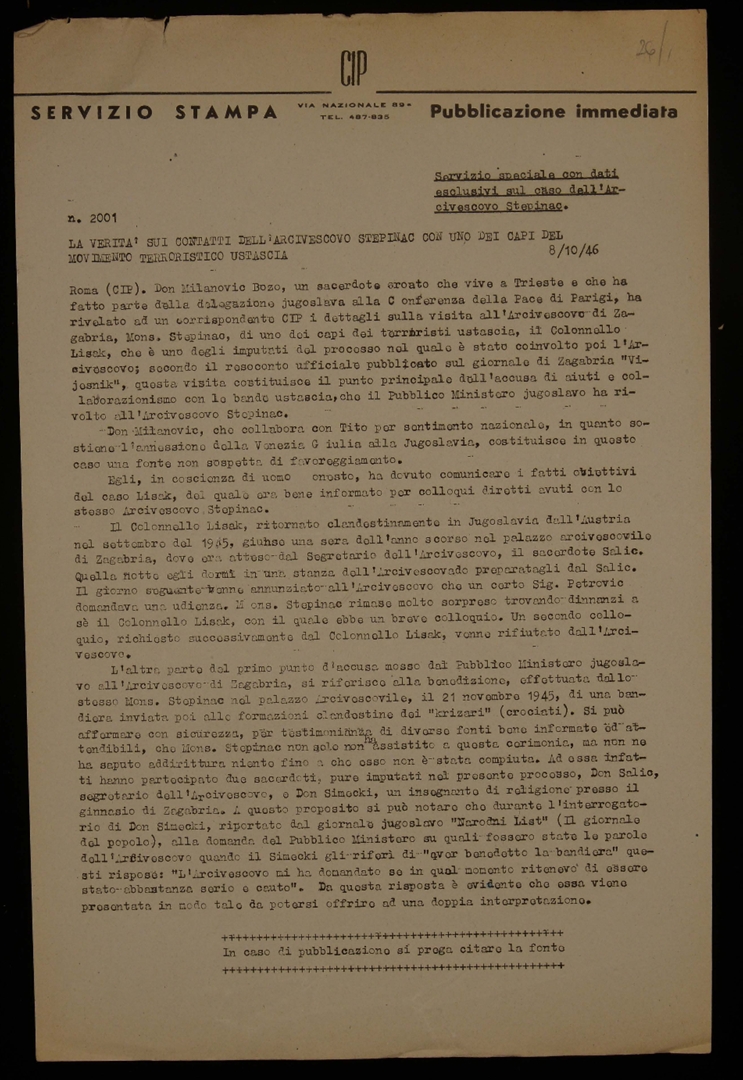 "La verità sui contatti dell'arcivescovo Stepinac con uno dei capi del movimento terroristico Ustascia", a cura dell'agenzia di stampa cattolica Centro di informazione Pro Deo - CIP