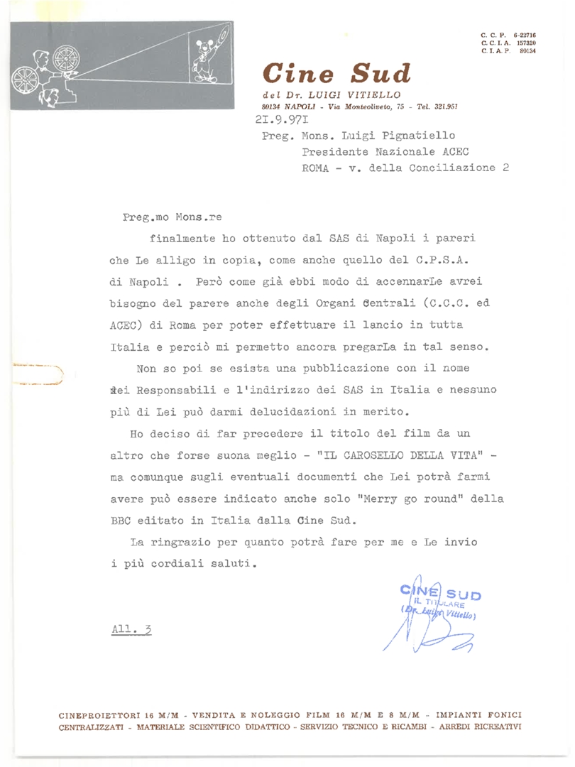 Lettera di Luigi Vitiello, titolare dell'agenzia Cine Sud di Napoli, a mons. Luigi Pignatiello, presidente dell'ACEC