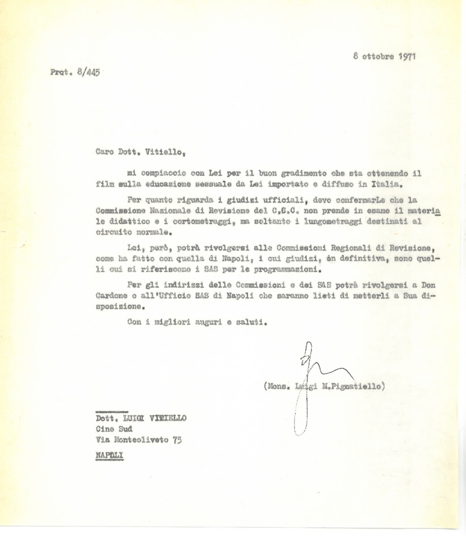 Lettera di mons. Luigi Pignatiello, presidente dell'ACEC, a Luigi Vitiello, titolare dell'agenzia Cine Sud di Napoli