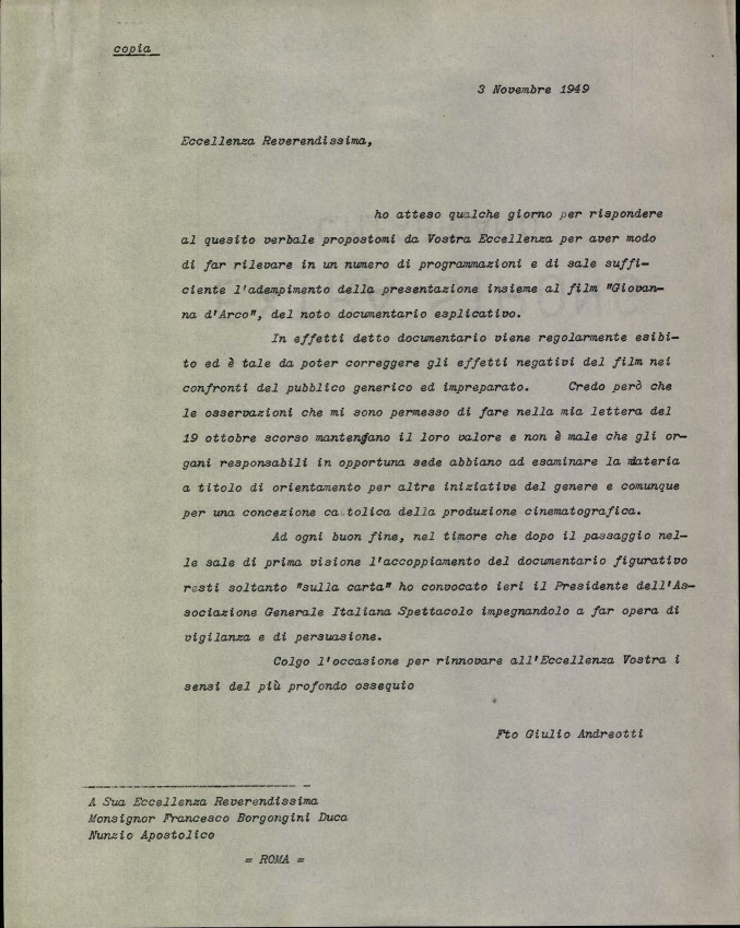 Lettera dell'on. Giulio Andreotti, sottosegretario di Stato alla presidenza del consiglio, al nunzio apostolico Francesco Borgongini Duca