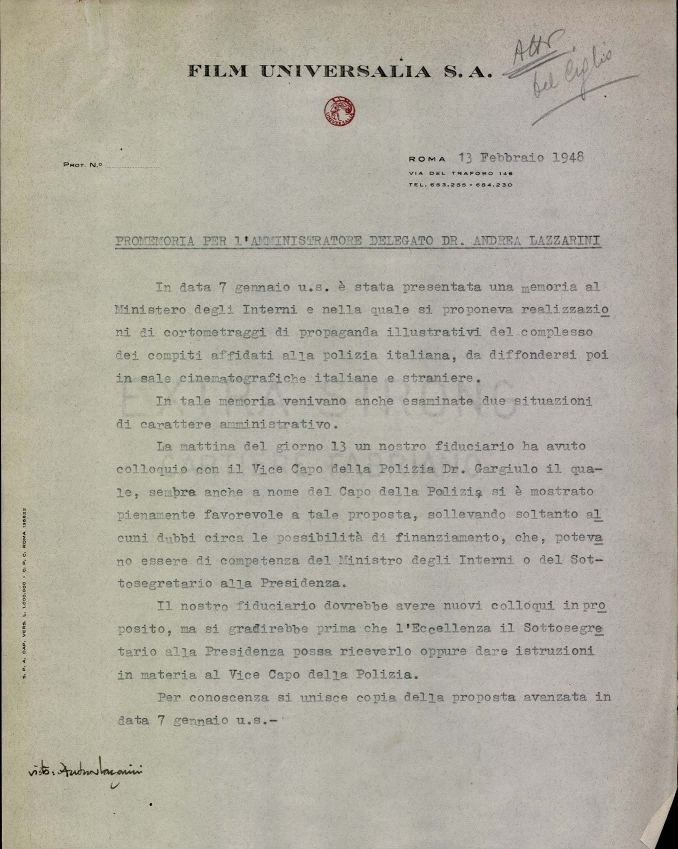 Lettera su carta intestata Film Universalia S.A. indirizzata al Ministero degli interni