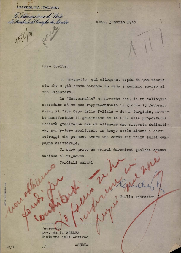 Lettera dell'on. Giulio Andreotti, sottosegretario alla presidenza del consiglio dei ministri, all'on. Mario Scelba, ministro dell'interno