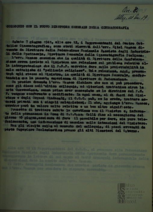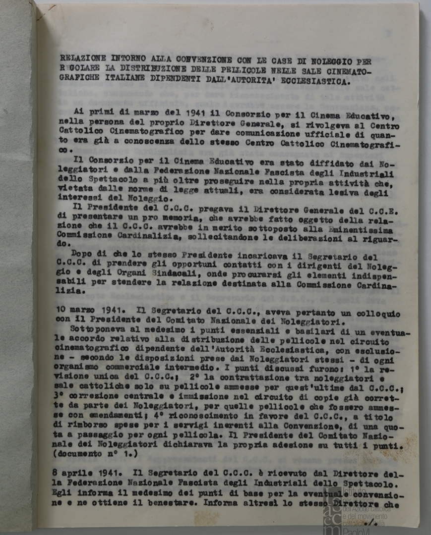 "Relazione intorno alla convenzione con le case di noleggio per regolare la distribuzione delle pellicole nelle sale cinematografiche italiane dipendenti dall'autorità ecclesiastica"