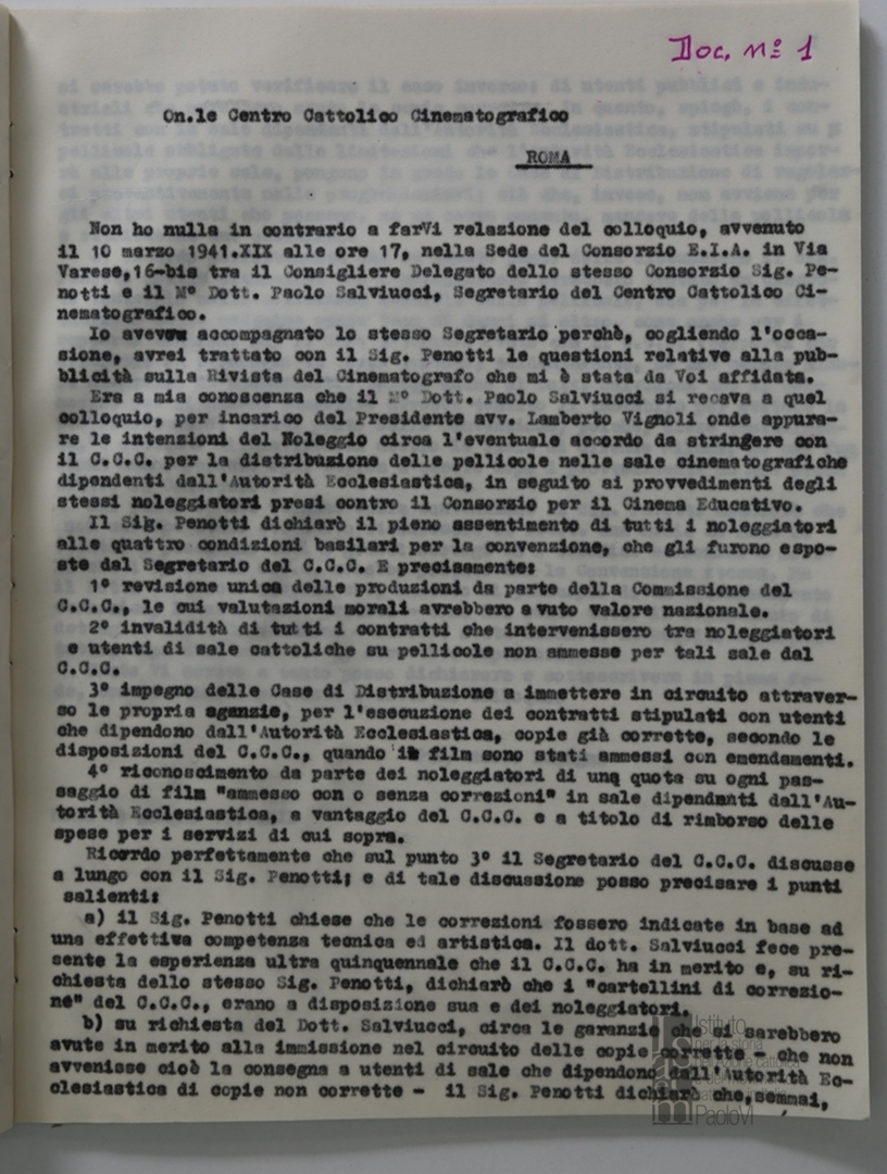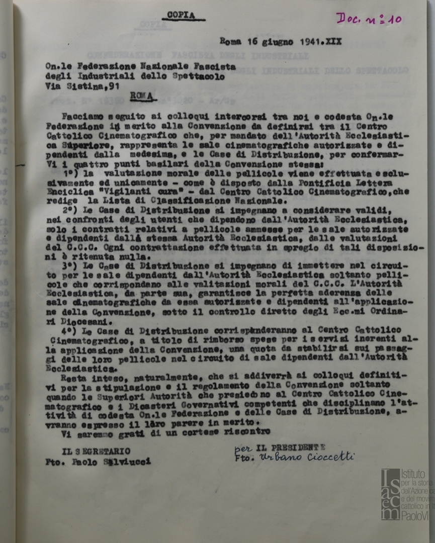Lettera a firma di Paolo Salviucci, segretario del Centro cattolico cinematografico - CCC e di Urbano Cioccetti, presidente, indirizzata alla Federazione nazionale fascista degli industriali dello spettacolo