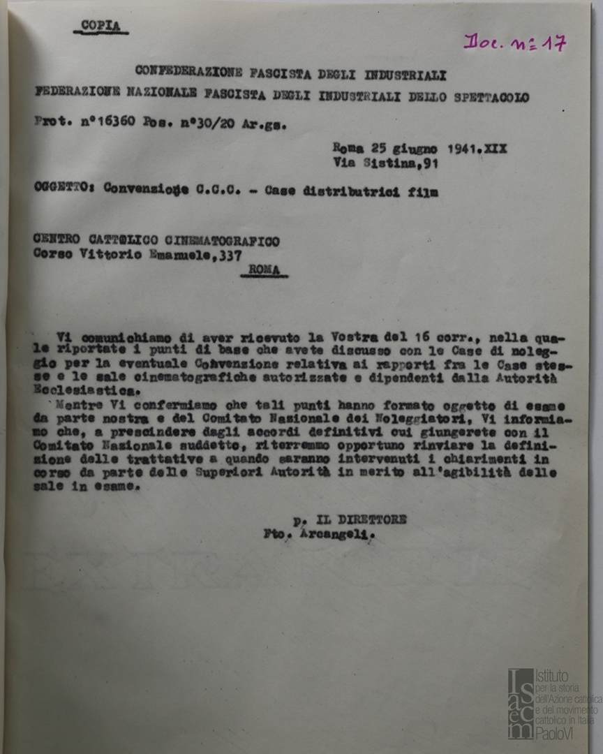 Lettera della Federazione nazionale fascista degli industriali dello spettacolo, a firma Arcangelo, al Centro cattolico cinematografico - CCC