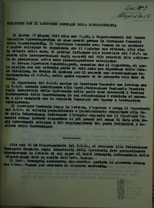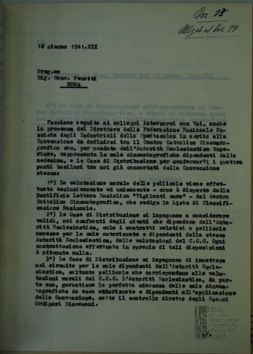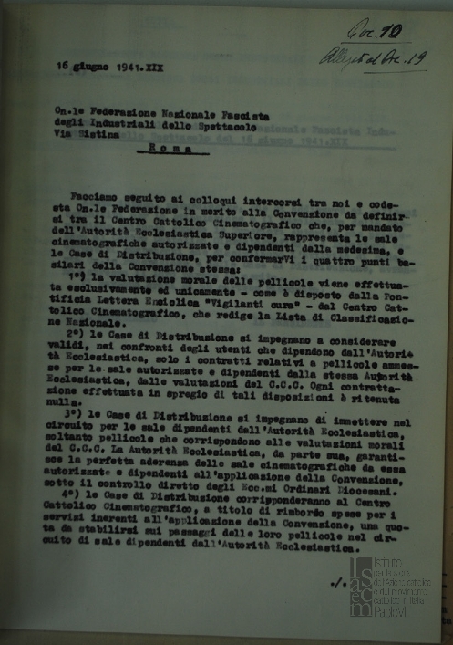Lettera della Federazione nazionale fascista degli Industriali dello spettacolo, a firma del direttore Francesco Arcangeli, al Centro cattolico cinematografico - CCC