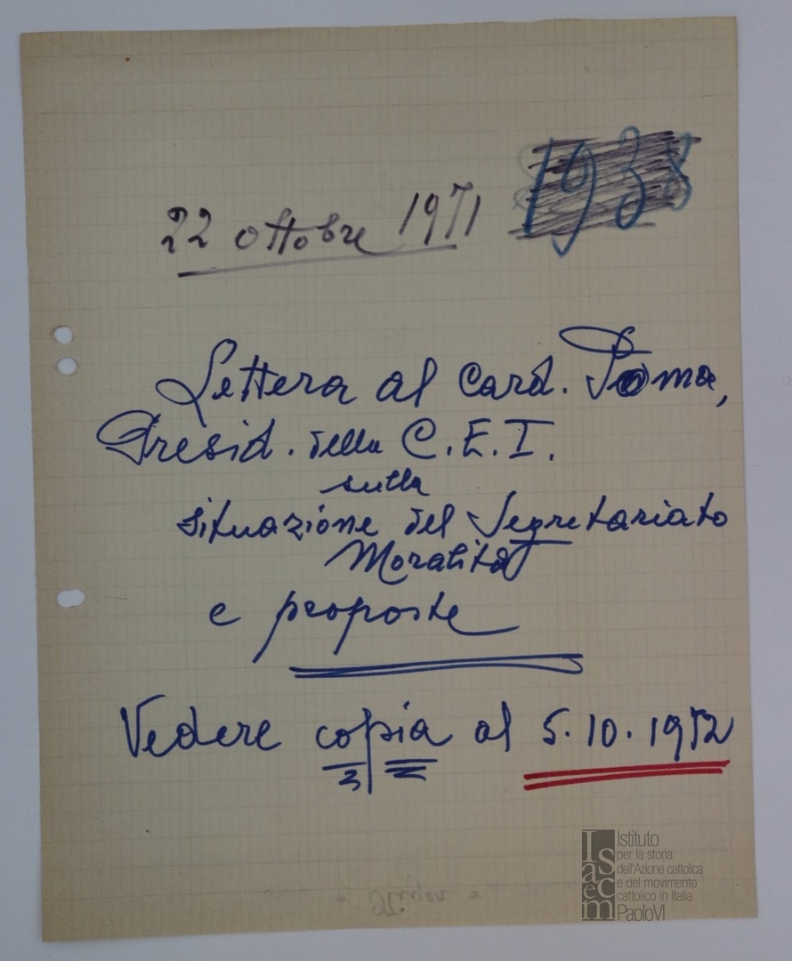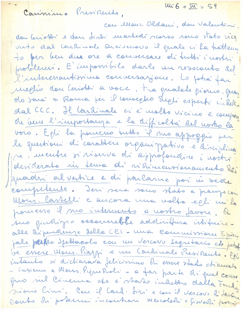 Lettera di mons. Ferdinando Prosperini al cardinale Antonio Poma, presidente della Commissione episcopale italiana - CEI