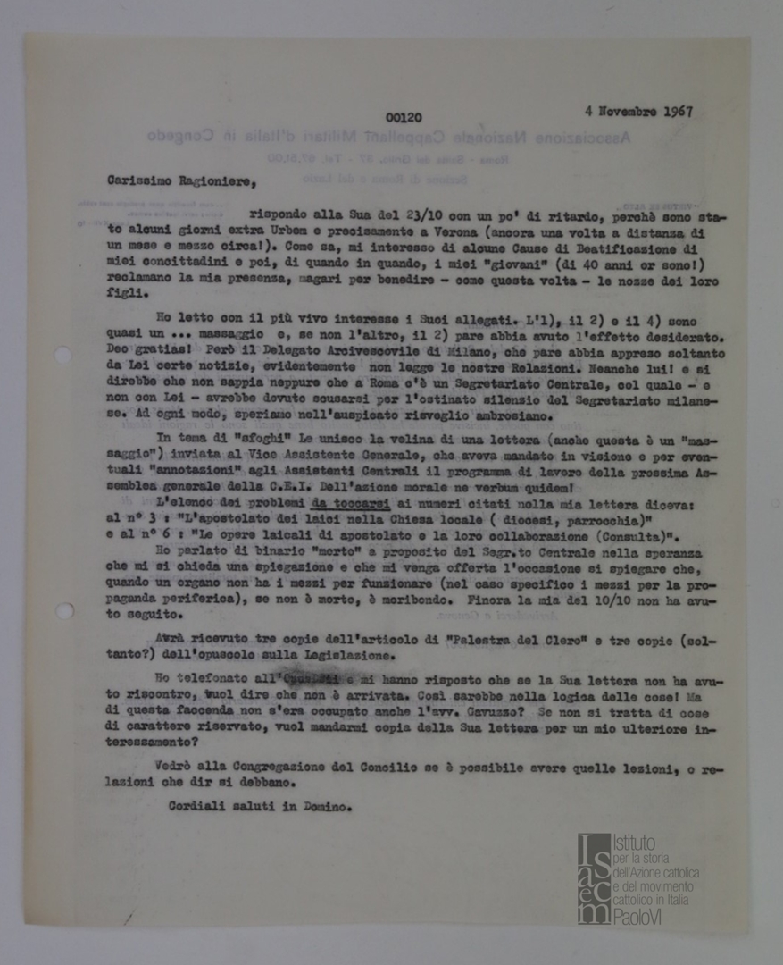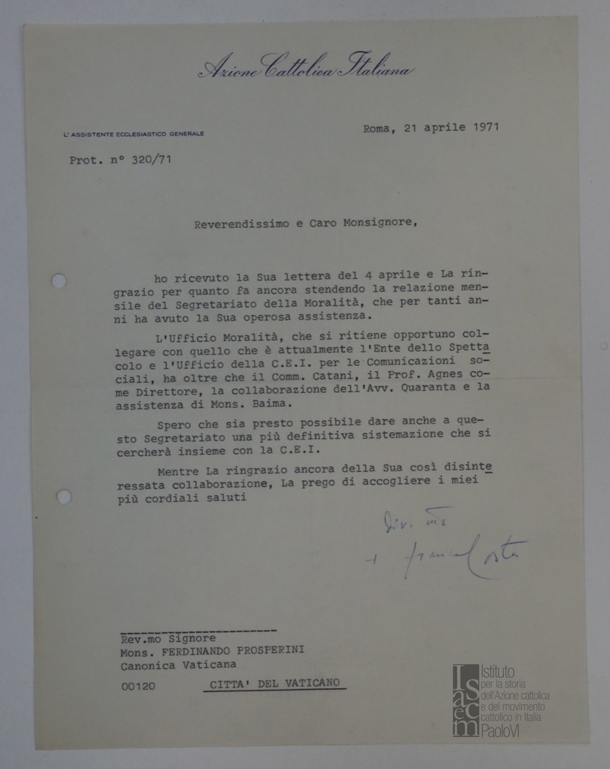 Lettera di Franco Costa, assistente ecclesiastico generale dell'ACI, a mons. Ferdinando Prosperini