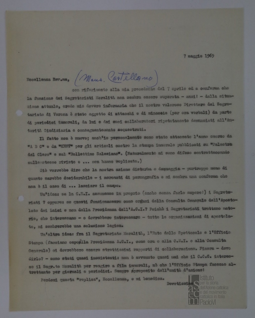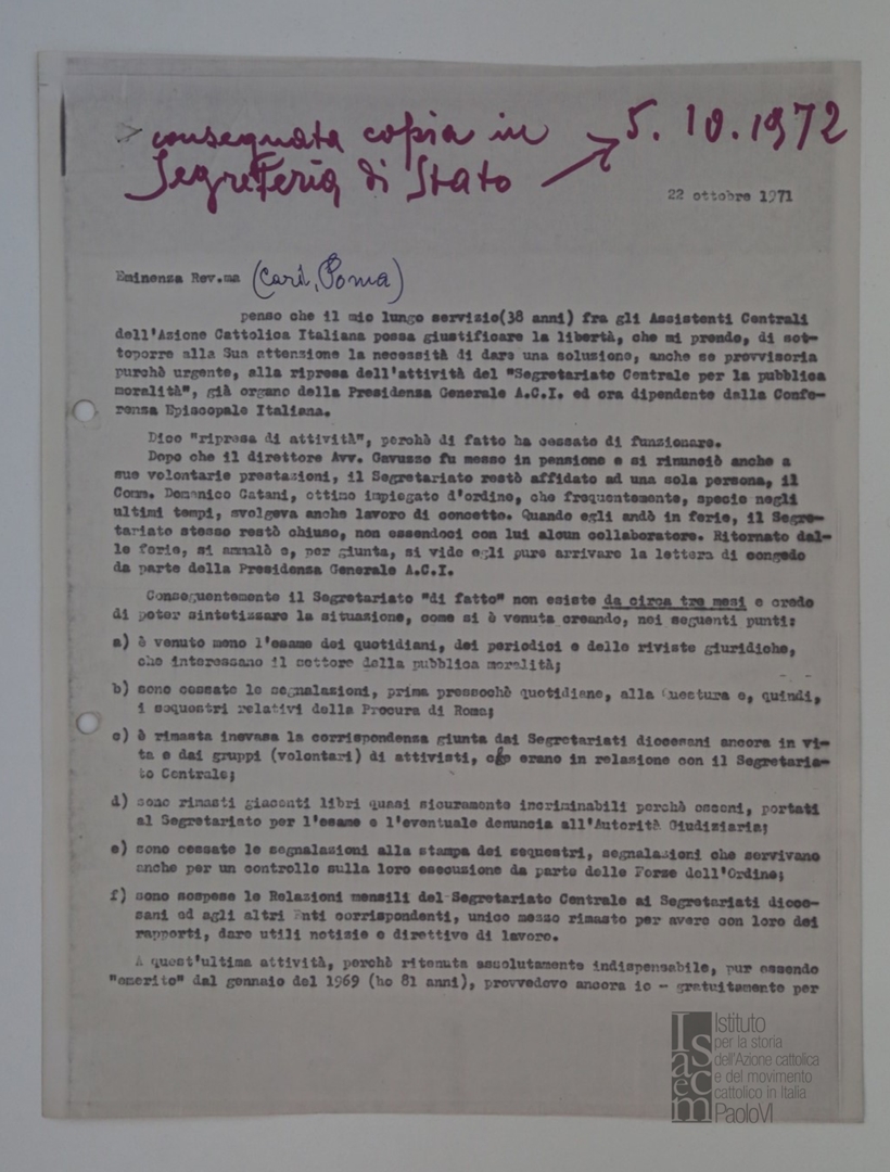 Lettera non firmata a mons. Mario J. Castellano, vescovo di Volterra e assistente ecclesiastico generale dell'ACI