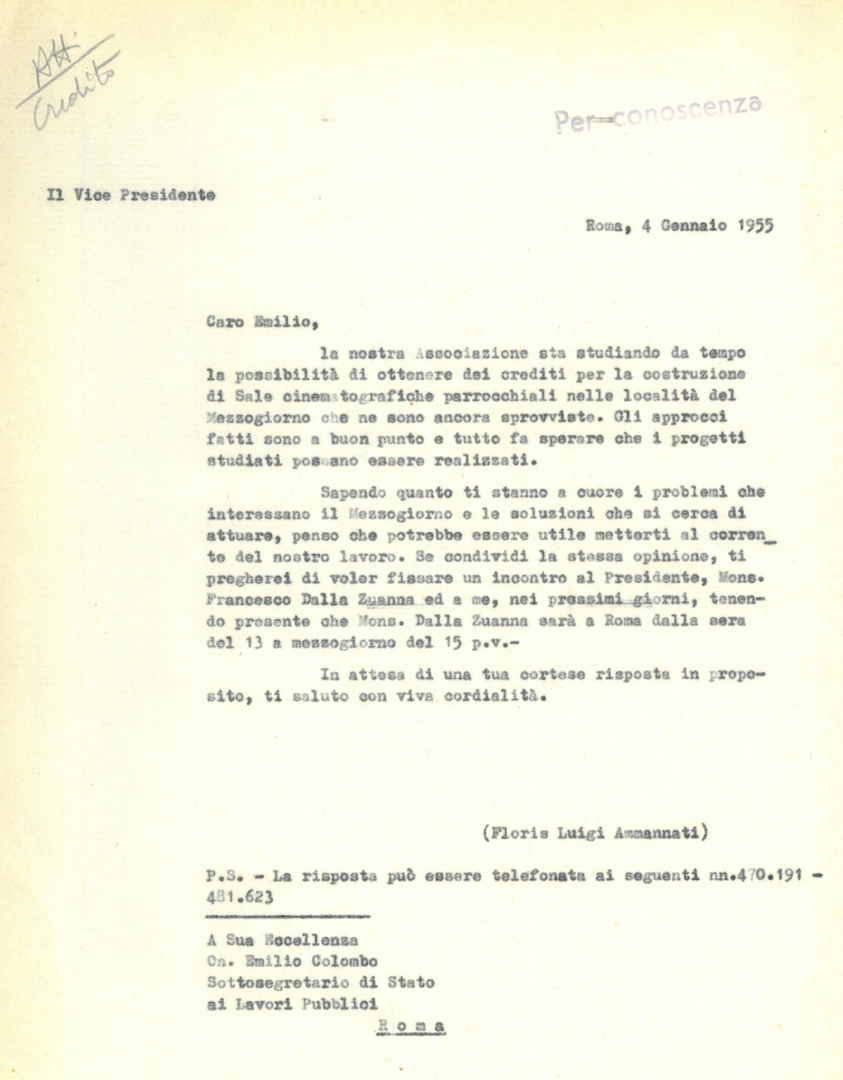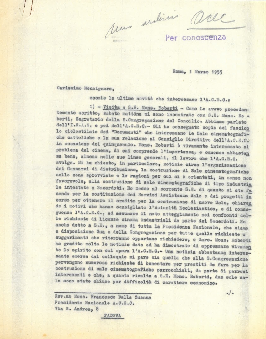 Lettera a firma di mons. Francesco Dalla Zuanna, presidente dell'ACEC e di mons. Albino Galletto, consulente ecclesiastico dell'Ente dello spettacolo, al prof. Luigi Gedda, presidente generale dell'Azione cattolica italiana - ACI