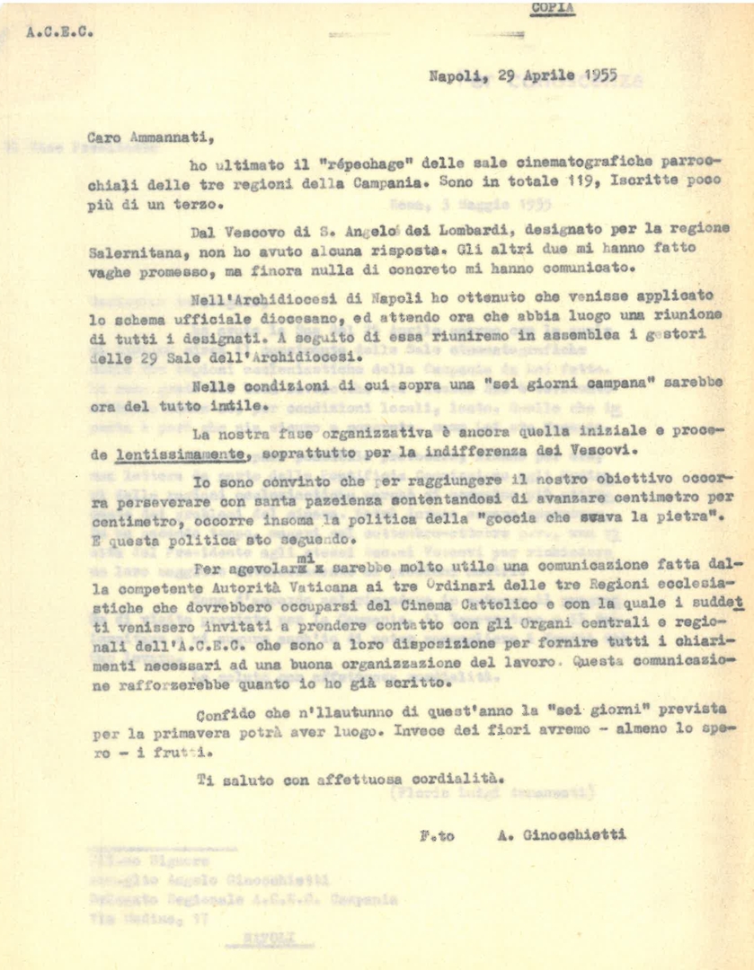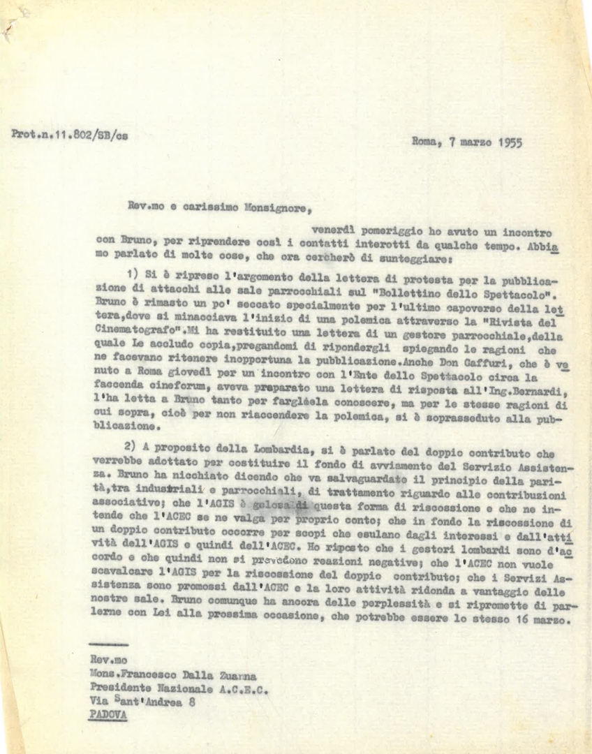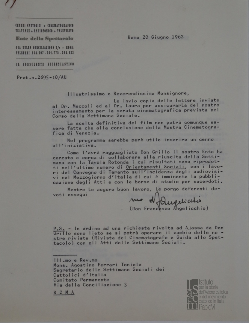 Lettera di don Francesco Angelicchio, consulente ecclesiastico dell'Ente dello spettacolo, a mons. Agostino Ferrari Toniolo, segretario delle Settimane sociali dei Cattolici d'Italia