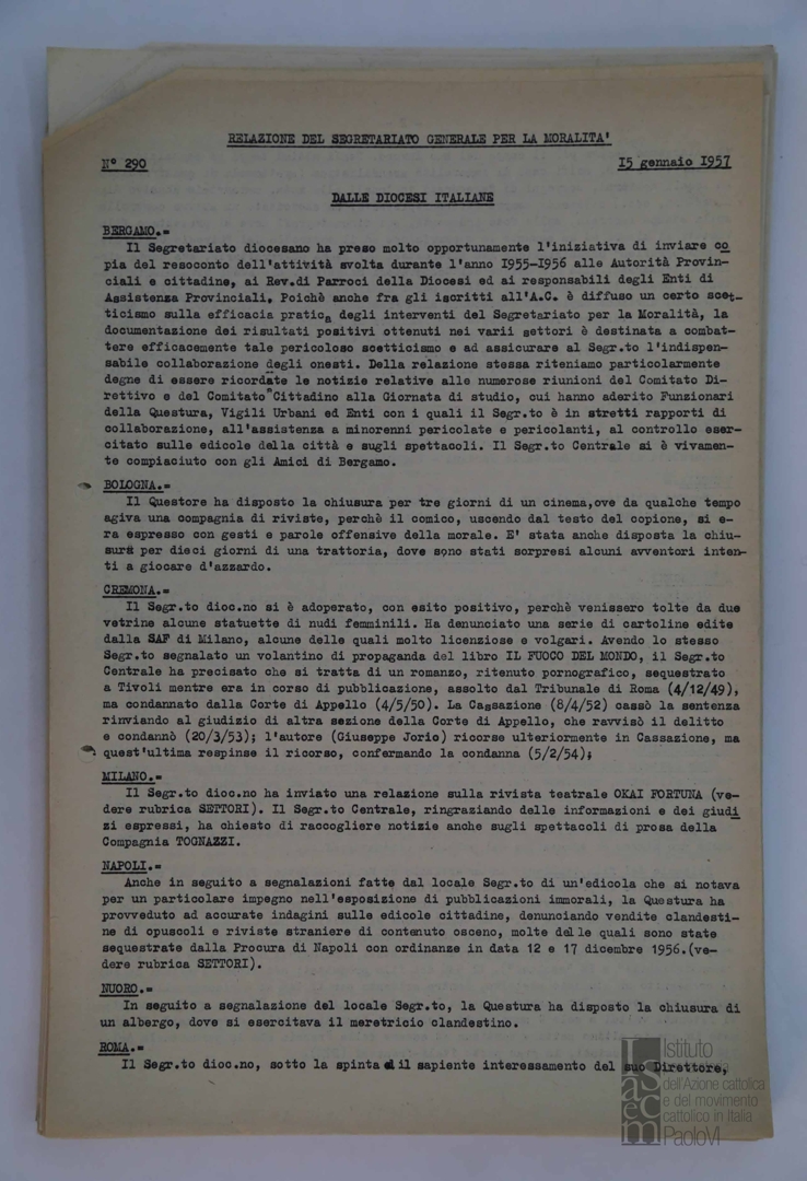 "Relazione del Segretariato Generale per la Moralità. Nr. 290"
