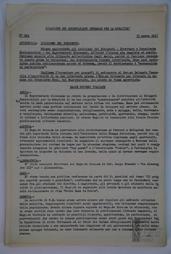 "Relazione del Segretariato Generale per la Moralità. Nr. 294"