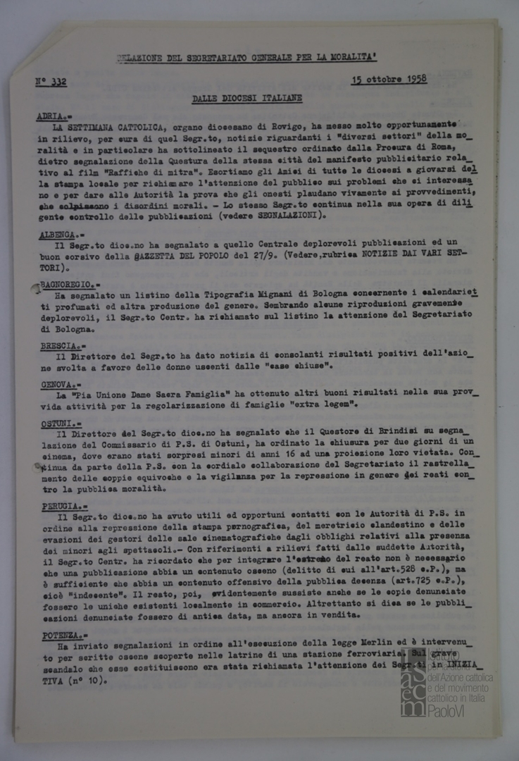 "Relazione del Segretariato Generale per la Moralità. Nr. 332"
