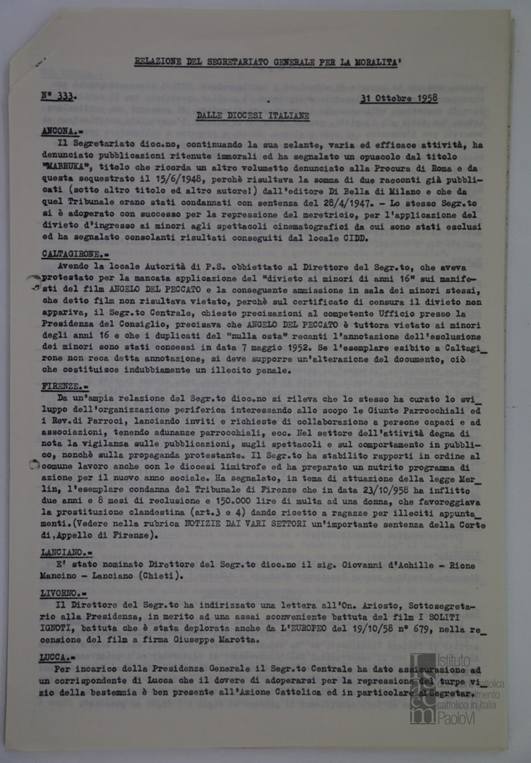 "Relazione del Segretariato Generale per la Moralità. Nr. 333"