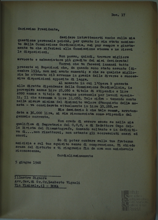 Lettera di Paolo Salviucci, segretario del Centro cattolico cinematografico - CCC, a Lamberto Vignoli, presidente del Centro