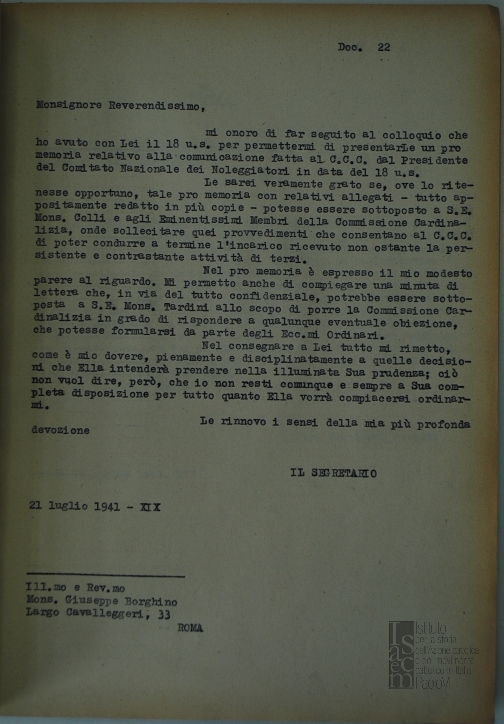 Lettera di Ferdinando Baldelli, presidente della Pontificia commissione assistenza profughi, ad Alcide De Gasperi