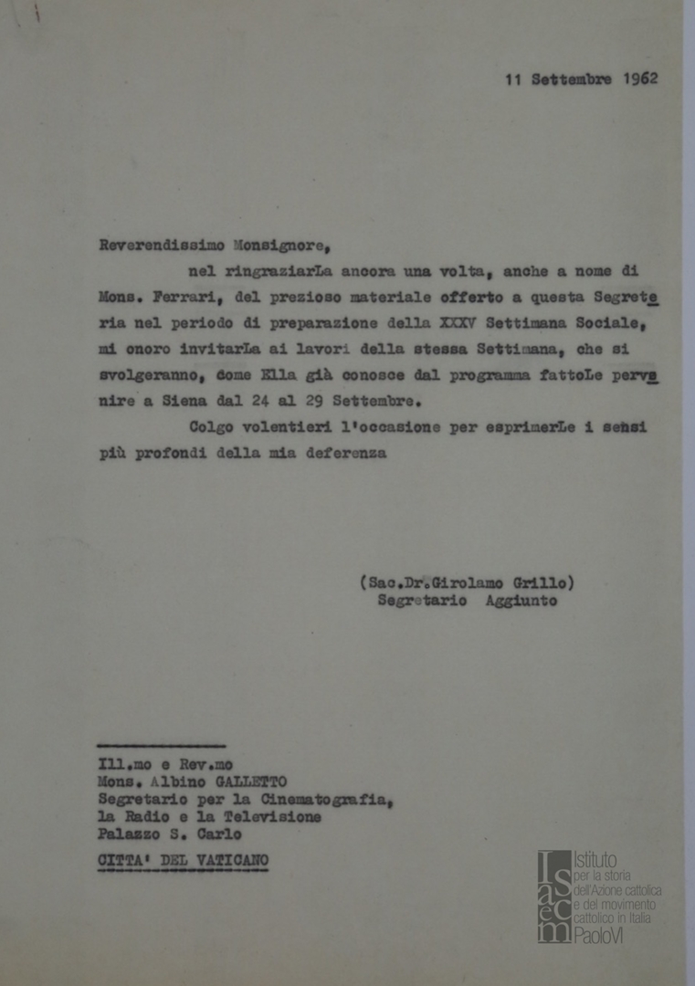 Lettera di don Girolamo Grillo, segretario aggiunto della Settimana sociale dei cattolici, a mons. Albino Galletto, segretario per la cinematografia, la radio e la televisione