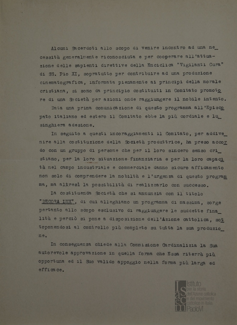 Pro memoria sulla costituenda società di produzione cinematografica Decora Lux