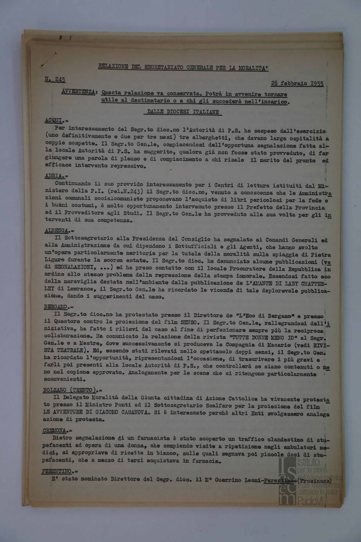 "Relazione del Segretariato Generale per la Moralità. Nr. 245"