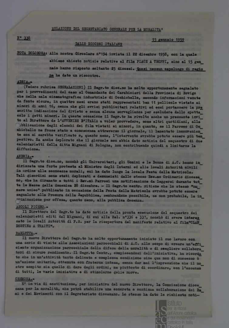 "Relazione del Segretariato Generale per la Moralità. Nr. 338"