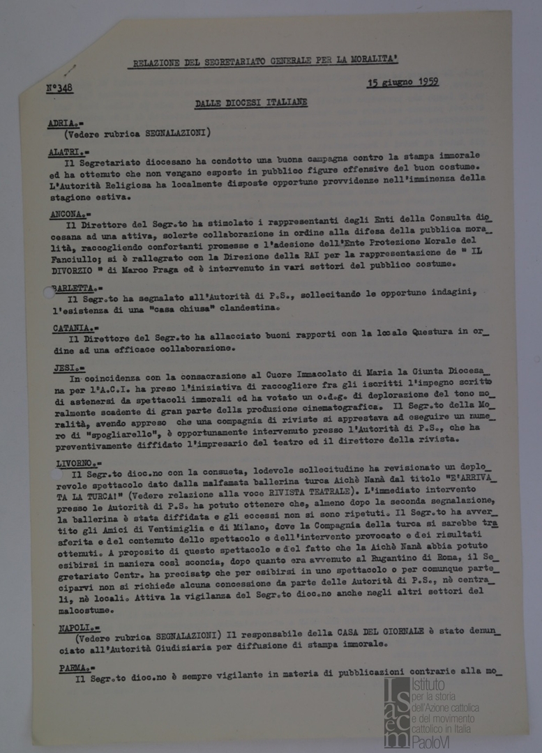 "Relazione del Segretariato Generale per la Moralità. Nr. 348"