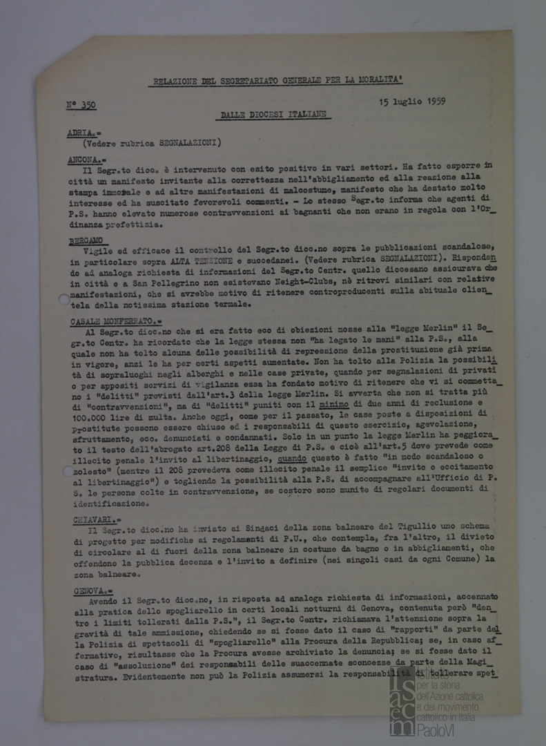 "Relazione del Segretariato Generale per la Moralità. Nr. 350"
