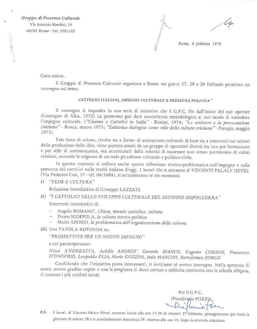 Convegno sul tema "Cattolici italiani, impegno culturale e presenza politica", organizzato a Roma dal Gruppo di Presenza Culturale nelle giornate del 27, 28, 29 febbraio 1976