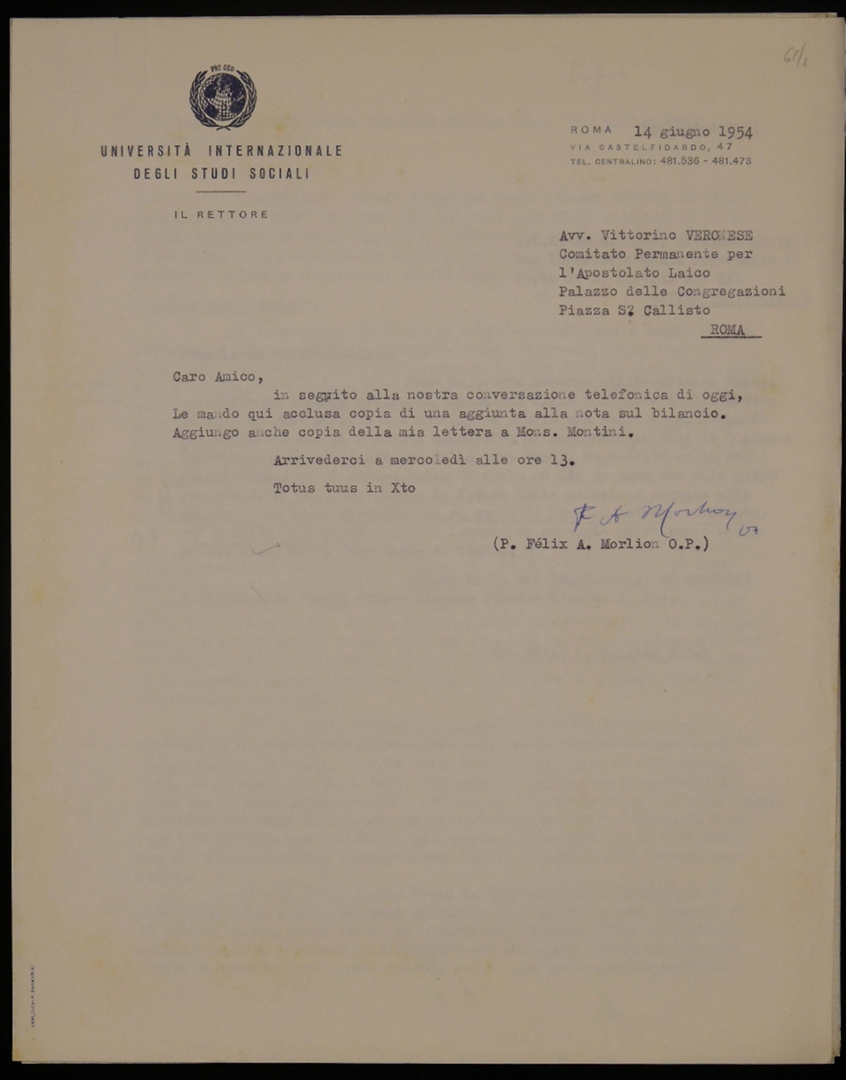 Lettera di mons. Giovanni Battista Montini, sostituto alla segreteria di Stato di Sua Santità, a padre Félix Morlion, rettore dell'Università internazionale di studi sociali