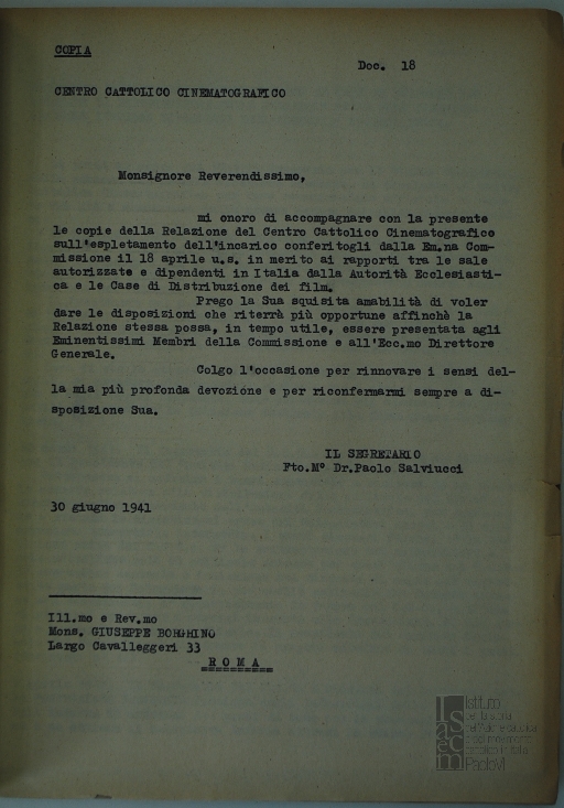 Lettera di Paolo Salviucci, segretario del Centro cattolico cinematografico - CCC, a mons. Giuseppe Borghino, vice direttore generale dell'ACI