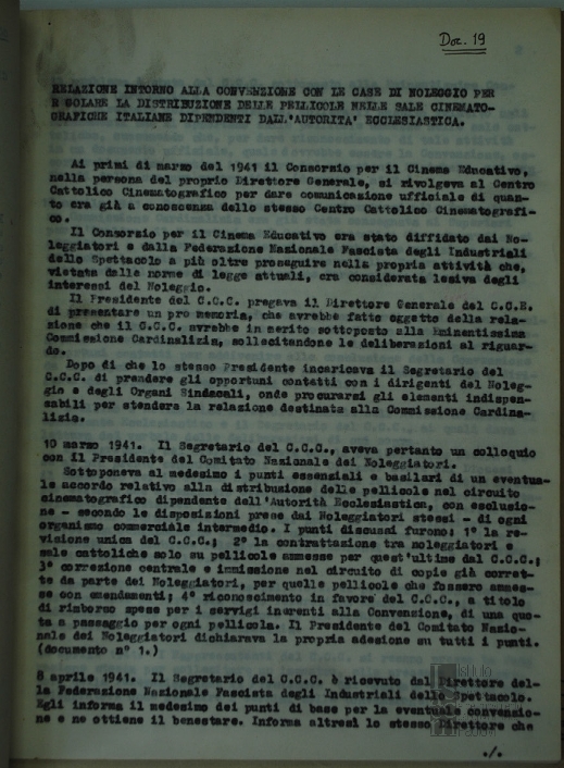 "Pro memoria" sulle trattative intercorse tra il Cento cattolico cinematografico - CCC, la Federazione nazionale fascista degli industriali dello spettacolo e il presidente del Comitato nazionale dei noleggiatori per la stesura della Convenzione riguardante le sale dipendenti dall'autorità ecclesiastica