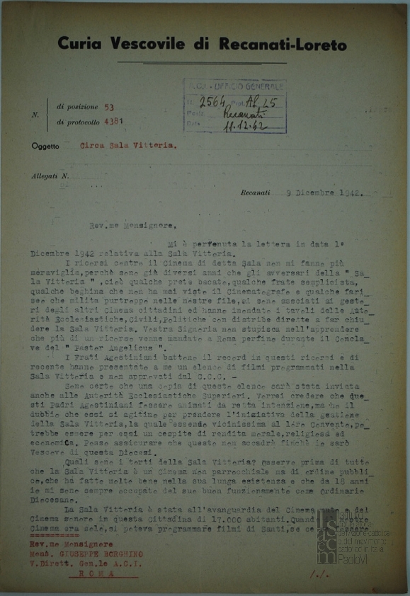 Lettera di mons. Aluigi Cossio, vescovo di Recanati-Loreto, a mons. Giuseppe Borghino, vice direttore generale dell'ACI