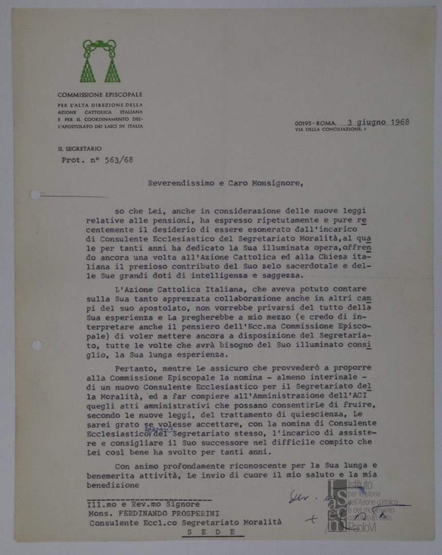Lettera di [...], segretario della Commissione episcopale per l'alta direzione dell'ACI e per il coordinamento dell'Apostolato dei laici in Italia, a mons. Ferdinando Prosperini, consulente ecclesiastico del Segretariato della moralità