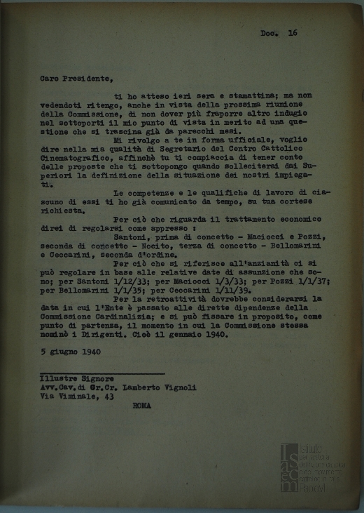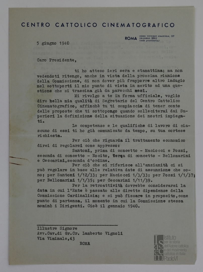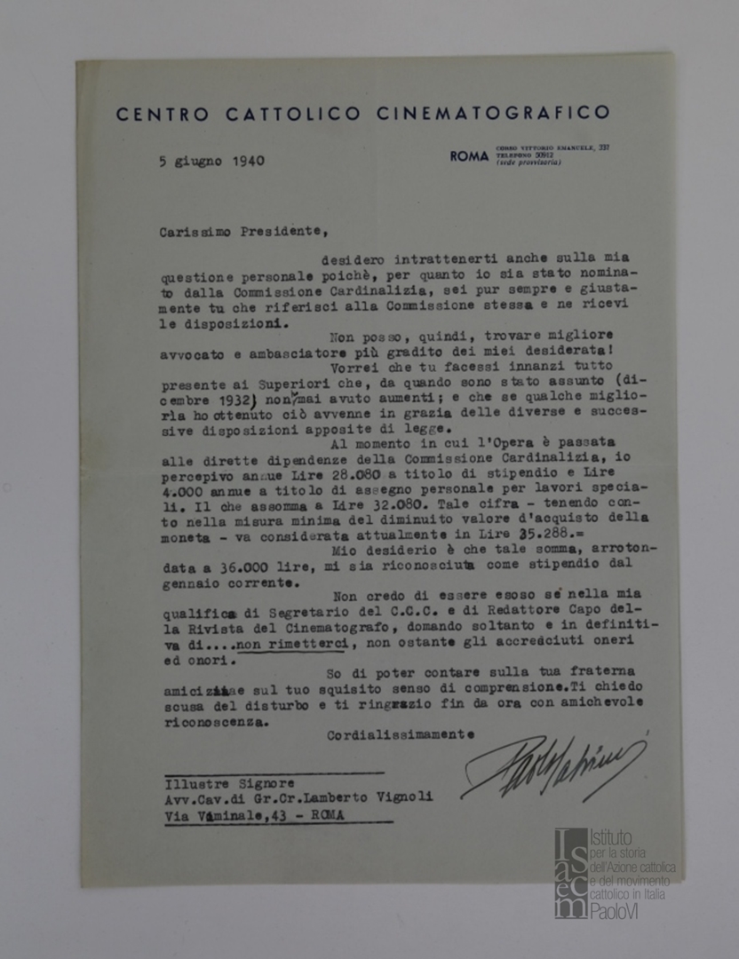 Lettera di Paolo Salviucci, segretario del Centro cattolico cinematografico - CCC, a Lamberto Vignoli, presidente del Centro