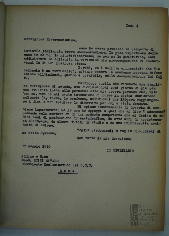 Lettera di Paolo Salviucci, segretario del Centro cattolico cinematografico - CCC, a mons. Luigi Civardi, consulente ecclesiastico del Centro