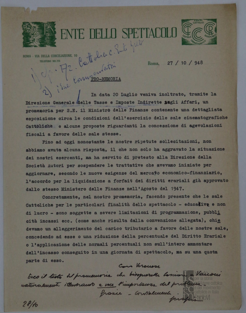 "Promemoria", a cura di Ugo Sciascia, segretario dell'Ente dello spettacolo, indirizzato a Vittorino Veronese, presidente generale dell'ACI
