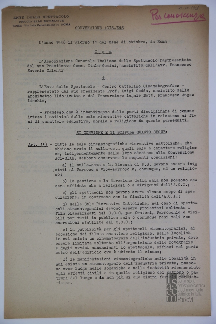 Accordo stipulato tra l'Associazione generale italiana dello spettacolo - AGIS e l'Ente dello spettacolo - Centro cattolico cinematografico - CCC