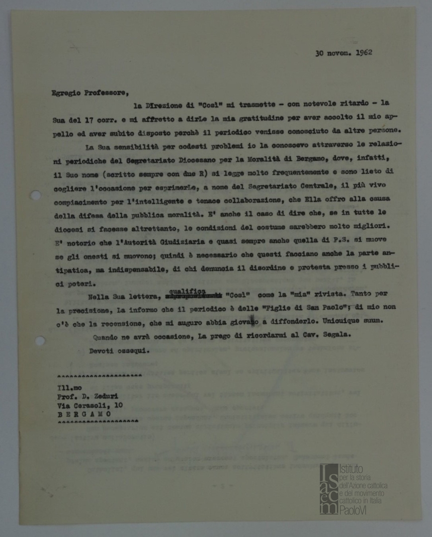 Lettera di mons. Ferdinando Prosperini a D. Zeduri, del Segretariato della moralità di Bergamo
