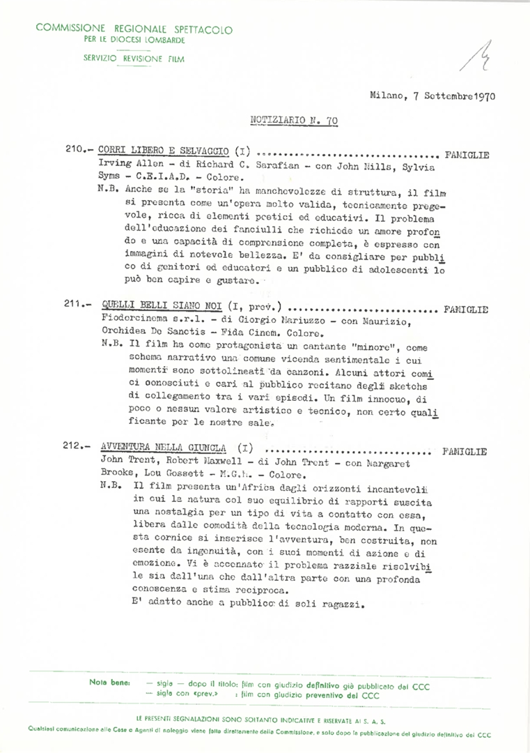 Commissione regionale spettacolo per le diocesi lombarde. Servizio revisione film. Notiziario, nn. 70-79