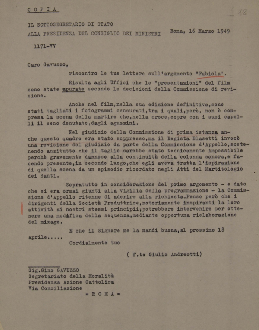 Lettera dell'on. Giulio Andreotti, sottosegretario di Stato alla presidenza del consiglio, a Gino Gavuzzo, direttore del segretariato per la moralità