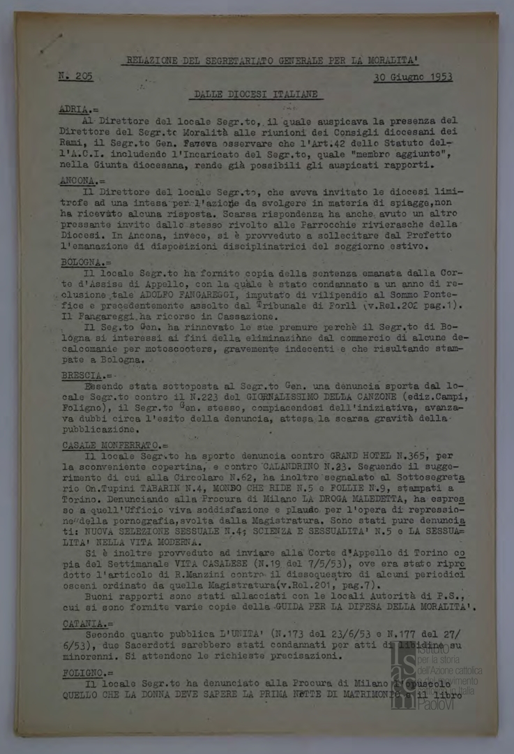 "Relazione del Segretariato Generale per la Moralità. Nr. 205"